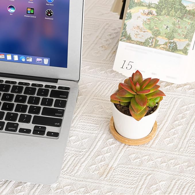 T4U 2.5 Inch Mini White Succulent Planter Pots with Bamboo Tray Round Set of 6, Tiny Ceramic Succulent Air Plant Flower Pots Cactus Faux Plants Containers, Gifts for Plant Lover, Home and Office Decor