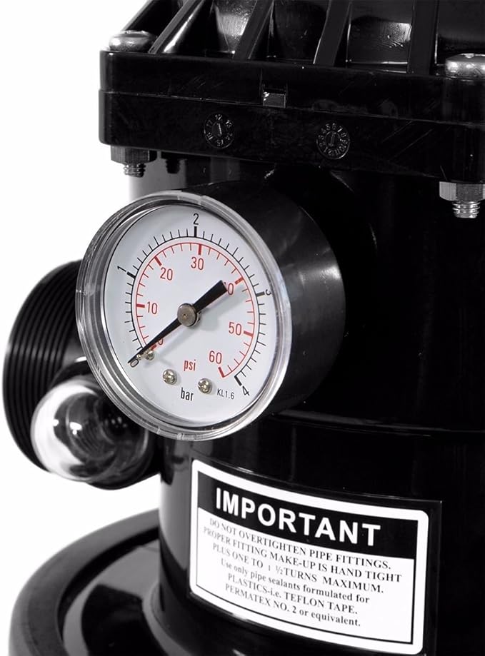 • Efficient Flow & Drainage - Features a 1.5" diameter main internal pipe, which allows for smooth, free-flowing performance. The filter also includes a built-in drain that helps to simplify winterizing and servicing. For added control and safety, a pressure gauge is included with the tank as well