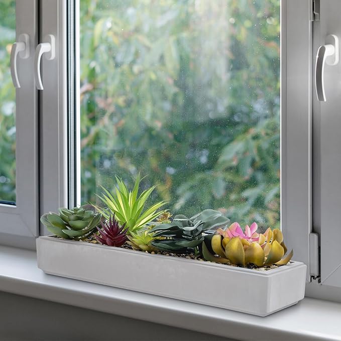 • Beautiful potted arrangement of artificial succulents displayed in a 15-inch rectangular cement gray modern planter, perfect for indoor use
