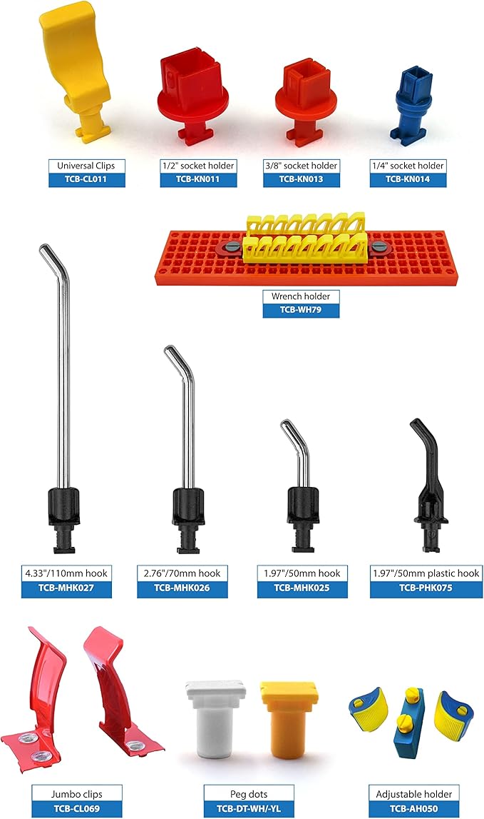• ACCESSORIES FOR TOOL ORGANIZER – Accessories to organize many different types of tools of the trade. Includes socket holders, universal clips, hanging hooks, tags, wrench holder, magnetic feet. Scale the organized area as large as you want.