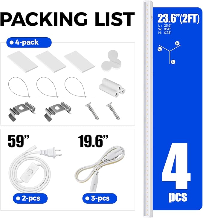• What You Get: 4 x Barrina T5 Grow lights, 2 x Power cords with ON/OFF switch, 4 x Connecting Cords(20''), 4 x Small Connectors, 8 x Installation Clips, 12 x Double-sided Tapes, 12 x cable ties