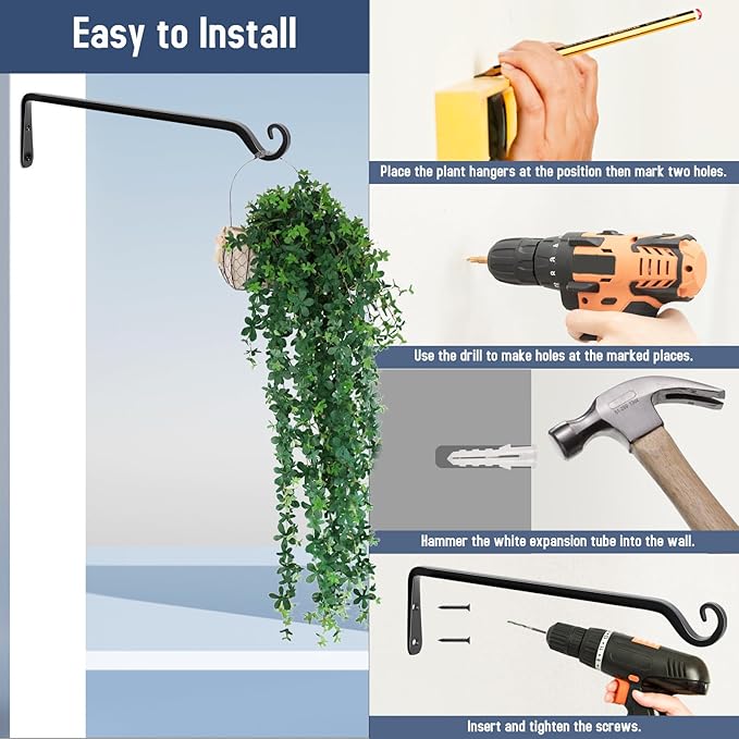 • 【EXCELLENT QUALITY】:The decorative plant hanging bracket is 4 inches in height and 12 inches from the wall, the screw length is 1.6 inches, making it suitable for hanging your favorite indoor and outdoor decorations. These hanging plant hooks are made of high-quality iron and coated with powder,they are rust and corrosion resistant. Premium quality makes them sturdy.