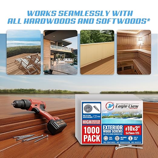 • PREMIUM EAGLE CLAW FASTENERS - Designed in the USA, Made in Taiwan, these are not just a low knock-off or your average run-of-the-mill decking screws. We only offer the best of the best, what we would use for our commercial & home projects. We didn't suddenly just decide to make these screws. After decades of experience in commercial timber projects such as deck, fence, outdoor & indoor furniture building, we know what works, and now, with Eagle Claw Fasteners, we get to share that with you.