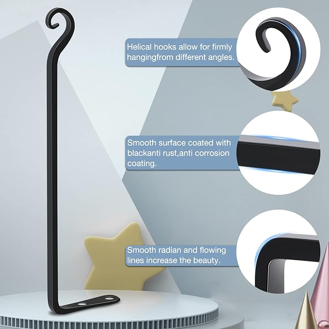 • 【EXCELLENT TECHNOLOGY】These hanging plant hooks adopt high quality solid metal structure, which is firm and not easy to bend. The surface of our hooks for hanging plants outside is coated with black coating, which is rust proof and durable. You can fix plant hanger bracket on the outdoor wall of your house without worrying about wind and rain.