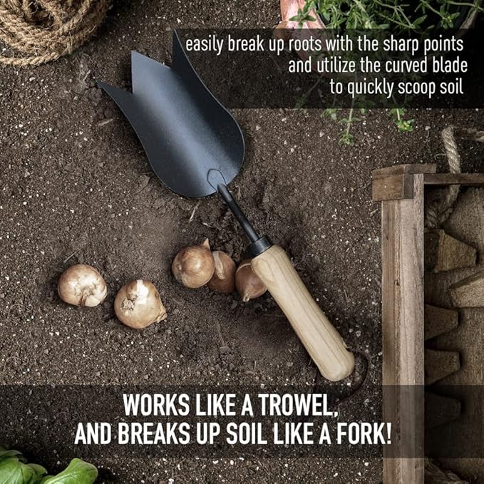 • 【TULIP TROWEL】 - Works like a trowel, and breaks up soil like a fork! An specialized take on the standard trowel, built with sharpened edges and three points. Easily break up roots with the sharp points and utilize the curved blade to quickly scoop soil.