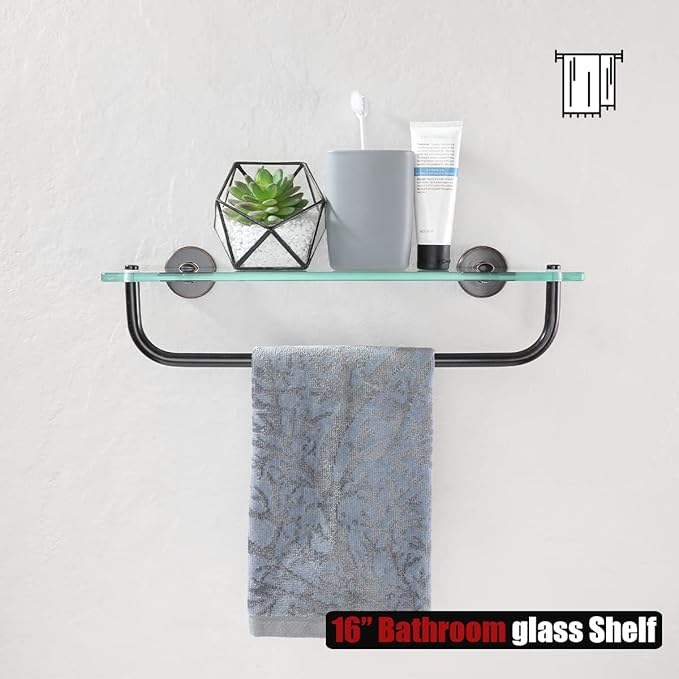 • 【Tempered Glass Shelf】16" x 5" ample room and a bar to keep bath items from toppling. Make your bathroom organized and get extra room.
