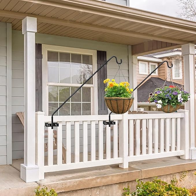 • High Quality Railing Hooks: The shepherd hooks for decks are made of heavy duty steel. The surface is coated with a black powder coating, which can be used outdoors for a long time even in bad weather and is not easy to rust. The sturdy brackets and curved rod tips help securely hold items in place.