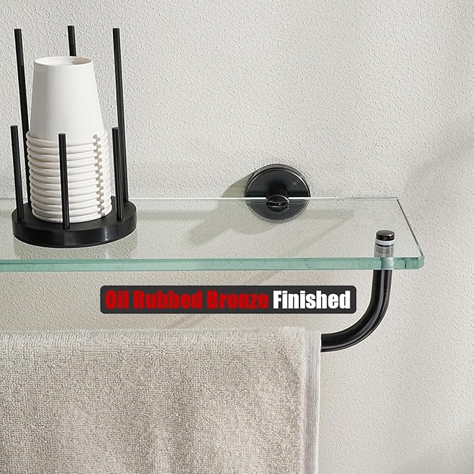 JQK Bathroom Glass Shelf Bronze, Shelf with 19 Inch Towel Bar Tempered Glass Shower Storage 20 by 5 inches, 304 Stainless Steel Oil Rubbed Bronze Wall Mount, TGS100L20-ORB