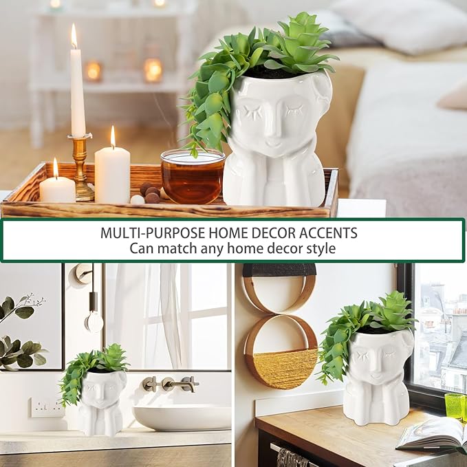 • Realistic Artificial Succulents - Our fake indoor plants are cute and unique, which are based on the shape of a human body, the eye-catching succulent plants forms the hair above, the ceramic pot are designed to be body parts, it has natural look, lifelike color and soft touch, it will make a stunning addition for your space