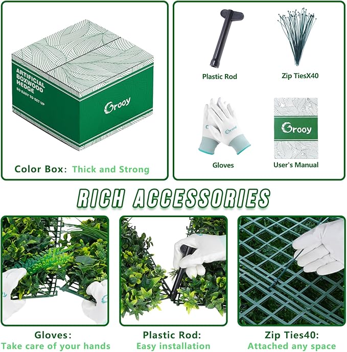 • 🌿【Premium Greenery, Built to Last】Grooy Artificial Boxwood Hedge Panels are made tough, using the latest in High-Density Polyethylene (HDPE). No matter the blazing sun or stormy weather, they'll stay vibrant and lifelike, adding a touch of nature that lasts.