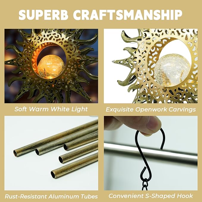 • RADIANT NIGHTS: At the top of the outdoor wind chimes are a decorative sun with an LED light. As the sun sets, the warm white LED inside the crackled glass orb illuminates. The light power through intricate cutout patterns, casting a pretty pattern on ceilings. It's a marvelous way to light up a dark porch in low-light conditions.