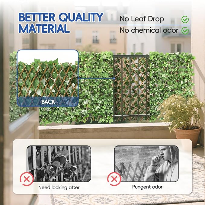 • Premium Quality Materials: The backing of the fence is crafted from natural wood, adding a touch of elegance and durability. The leaves are made of high-quality polyethylene, which gives them bright, vibrant colors. They are UV-resistant, so they won't fade or deteriorate even when exposed to harsh sunlight