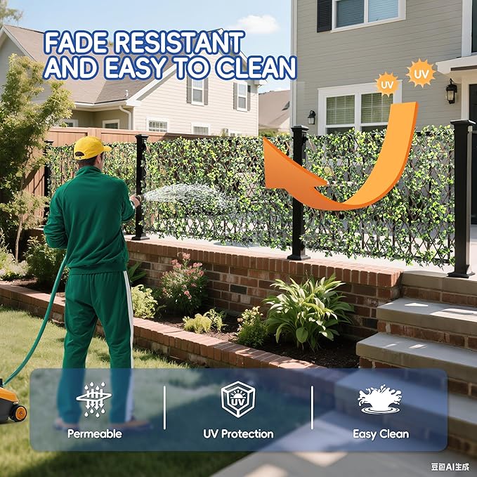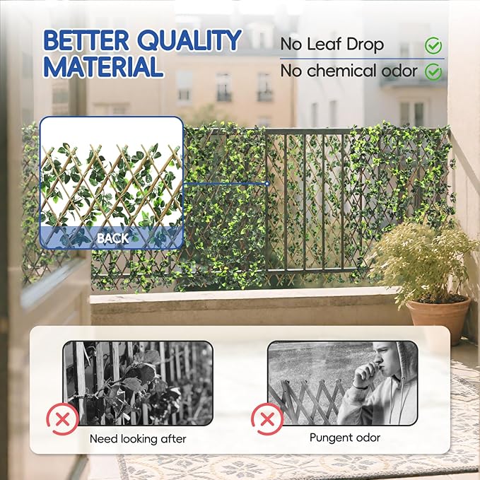 • Premium Quality Materials: The backing of the fence is crafted from natural wood, adding a touch of elegance and durability. The leaves are made of high-quality polyethylene, which gives them bright, vibrant colors. They are UV-resistant, so they won't fade or deteriorate even when exposed to harsh sunlight