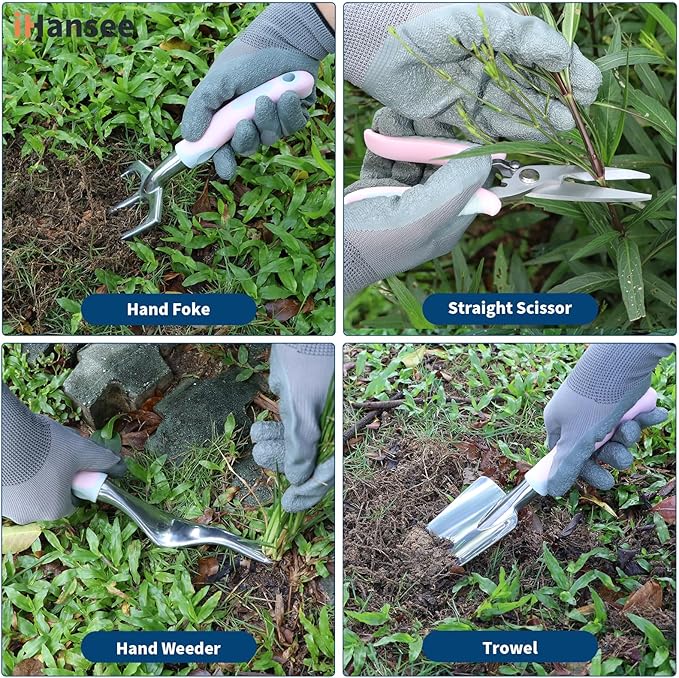• Durable and Rust-Resistant Tools: Crafted from aluminum alloy, iHansee gardening tools are lightweight yet strong, offering long-lasting durability and rust resistance. Each tool has an ergonomic concave-convex handle made of PP+TPR for a comfortable grip. Designed to reduce strain on wrists and hands, the handles provide excellent leverage for digging, planting, and weeding.