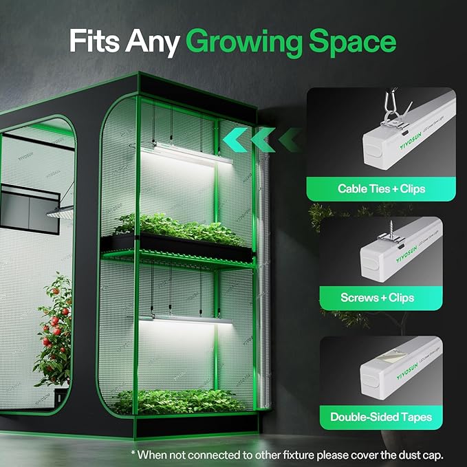 • Flexible Installation Options: Offers three installation methods and a daisy chain design with two connection options to fit any grow space; Hang with cable ties, fix with screws, or stick with double-sided tape; Connect via extension cables or directly with connectors; Includes all accessories
