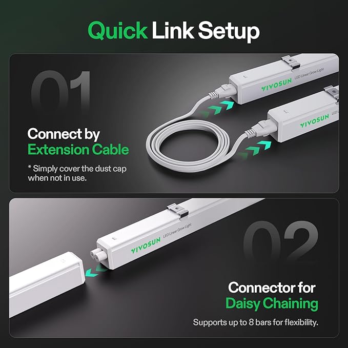 • Flexible Installation Options: Offers three installation methods and a daisy chain design with two connection options to fit any grow space; Hang with cable ties, fix with screws, or stick with double-sided tape; Connect via extension cables or directly with connectors; Includes all accessories
