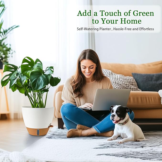 • 🌿 【Self-Watering Feature】The Fielda 10 Inch Plastic Planter comes with a built-in self-watering system that uses absorbent cotton wicks to draw water from the bottom tray into the planter. This ensures your plants stay hydrated with less effort, saving you from frequent watering. Whether you're a busy gardening enthusiast or away for long periods, you can easily maintain your plants' moisture balance, ensuring they get the right amount of water and nutrients.