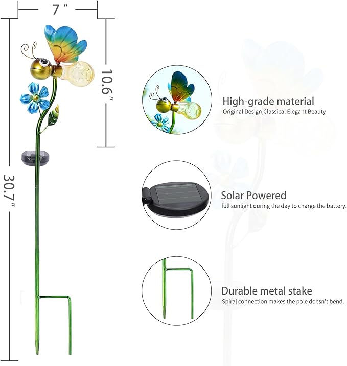 • 【Natural Garden Decor】The wings of the flower-shaped bee tail lights will dance when there is wind, providing a dreamy embellishment for garden paths, backyards, courtyards, flower beds, and lawn art, creating a fairy-tale courtyard atmosphere, and becoming the most eye-catching outdoor garden decoration at night.