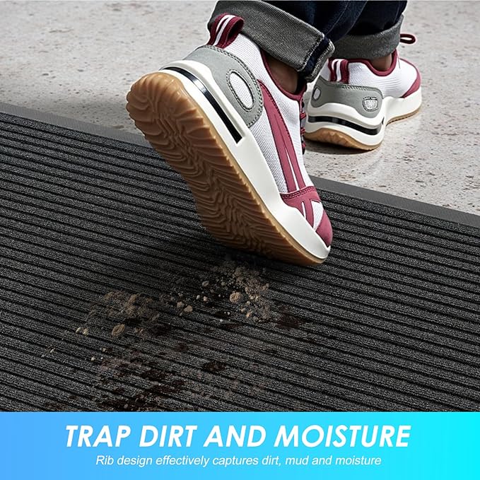 • Capture Dirt and Moisture:The heavy-duty door mat super absorbent, featuring a deep-grooved stripe design of door mat on the surface effectively captures dirt, dust, sand, and moisture and other clutter. The sturdy rubber edge will not accumulate water. Even rainy, snowy weather will keep your home dry and clean.Making it an excellent choice as a front door mat indoor and outdoor.