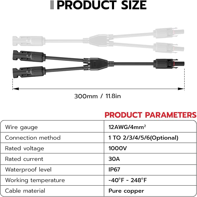 • PARAMETER: Rated Current: 30 A; Rated Voltage: 1000 VDC ;Waterproof Rating: IP67; Supports 12-10 AWG (4mm² - 6mm²) solar cables; works from -40℉ to 221℉