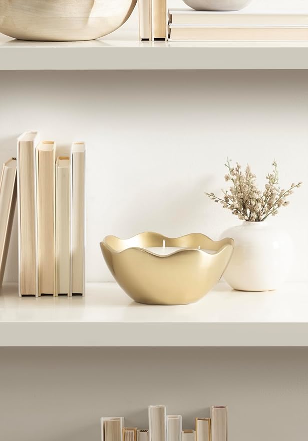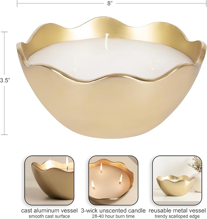 • Scalloped Metal Bowl Design: Add hints of texture and dimension to your space with this cast aluminum candle vessel and its fun wavy edges
