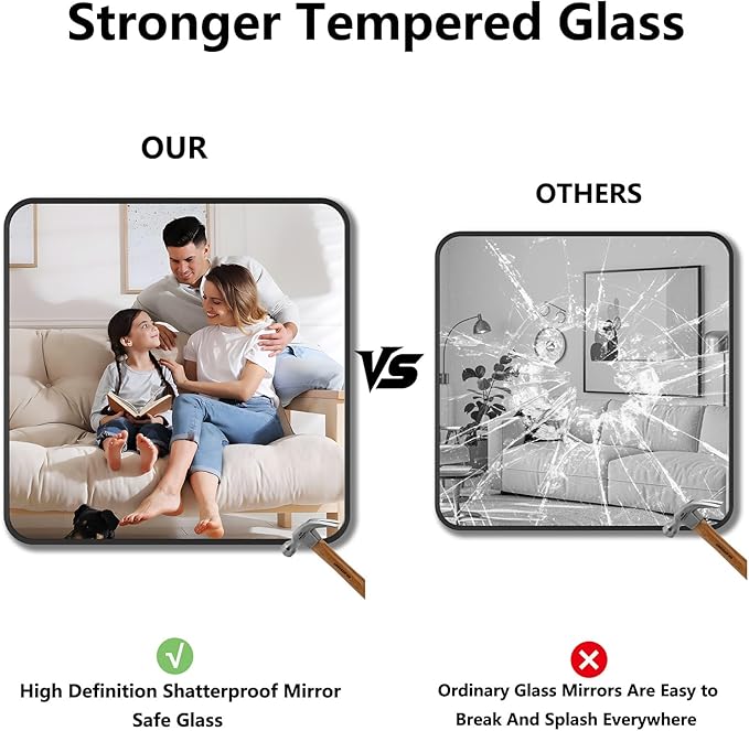 • Safe & Secure Tempered Glass: Built with shatterproof tempered glass and rust-resistant aluminum frame, this wall mirror for bathroom mounts securely above sinks. Steam-proof design withstands daily showers and heavy use—zero cracks, rust, or warping. Sleek, reliable, and perfect for high-traffic bathrooms: clear reflections, durable protection.