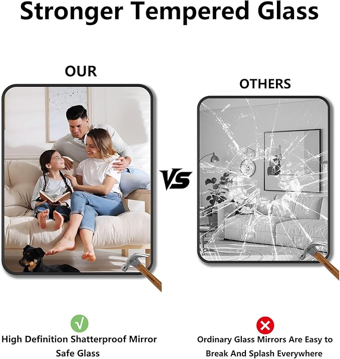 • Safe & Secure Tempered Glass: Built with shatterproof tempered glass and rust-resistant aluminum frame, this wall mirror for bathroom mounts securely above sinks. Steam-proof design withstands daily showers and heavy use—zero cracks, rust, or warping. Sleek, reliable, and perfect for high-traffic bathrooms: clear reflections, durable protection.