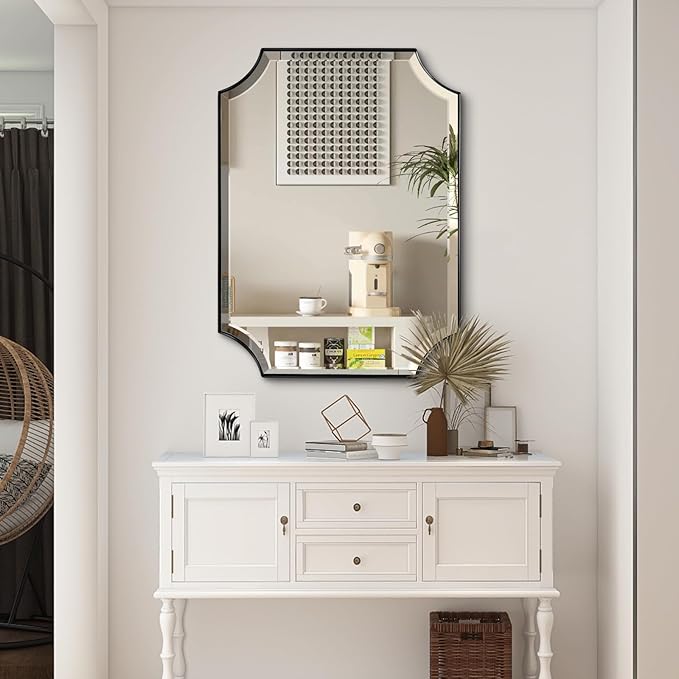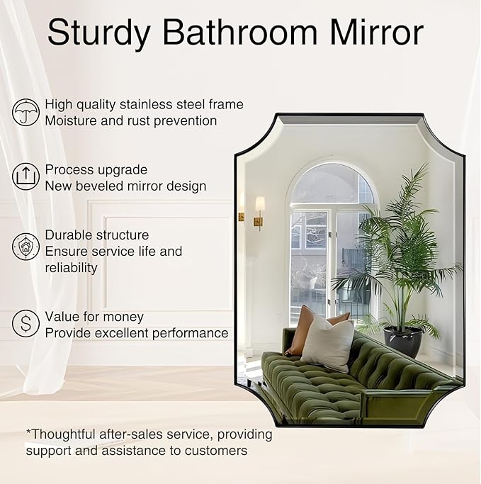 • Simple and Genrous Design: This modern bathroom mirror features a minimalist irregular design that adds depth and dimension to the space, effectively reflecting natural or artificial light into the room, helping to brighten up the room and visually enlarge it
