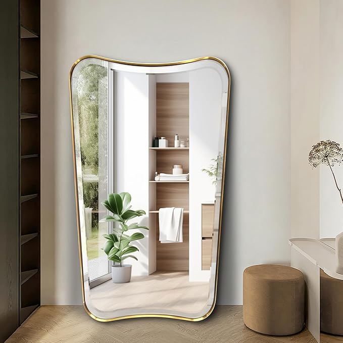 • Sturdy Bathroom Mirror: This modern wavy bathroom mirror features the most classic brushed finish ever, the fully sealed frame to make the mirror shockproof and more stable. 4 mm glass floats on a metal frame with a thin 1/12-inch (0.2 cm) gap around it. And the mirror is beveled where it meets the frame, adding elegance and class to the bathroom