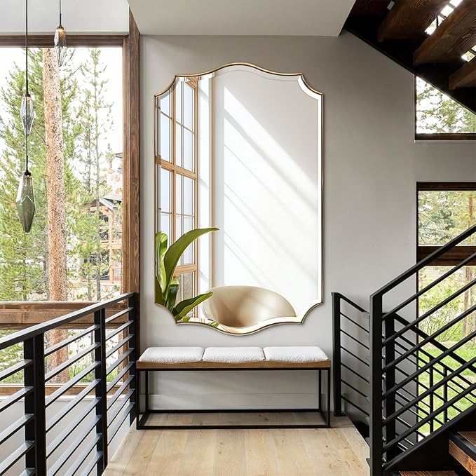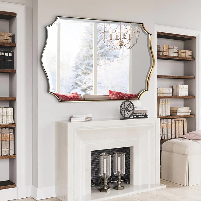 POZINO Scalloped Beveled Mirror, 30"x48" Large Brass Rectangle Mirrors for Over Sink, Gold Wavy Vanity Mirrors, Irregular Shaped Mirror for Bathroom Living Room Bedroom Fireplace Entryway
