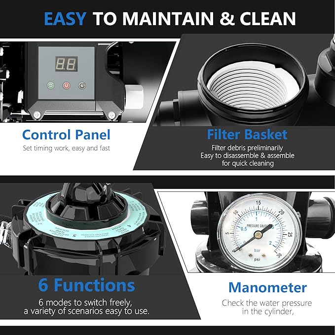 • 6-Way Valve: Featuring a 6-way valve, this pool sand pump is adaptable for various filtration needs, ensuring a pristine pool environment.