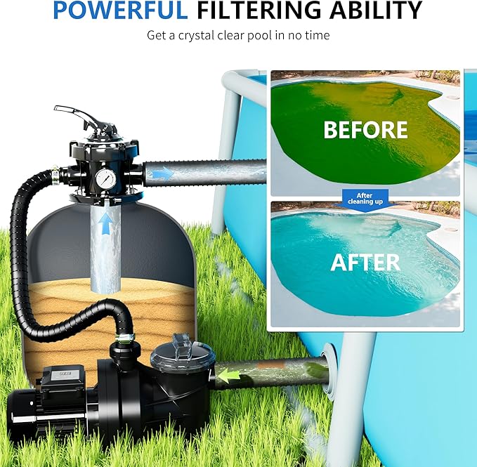 • Maximum Flow Rate: With an impressive flow rate of 4500GPH, Foting sand filterpump is ideal for pools up to 18000gallons, ensuring swift and thorough water filtration.