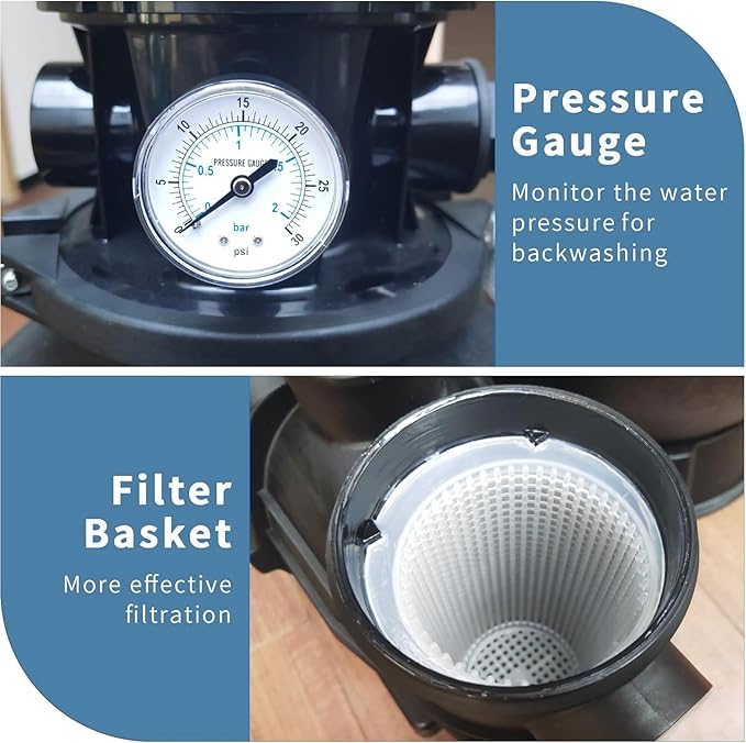 • 6-Way Valve: Features a 6-way valve with a stable and reliable symmetric channerl and anti-turbulence design. That easily adapts to different filtration needs, ensuring your pool environment stays crystal clear blue all summmer